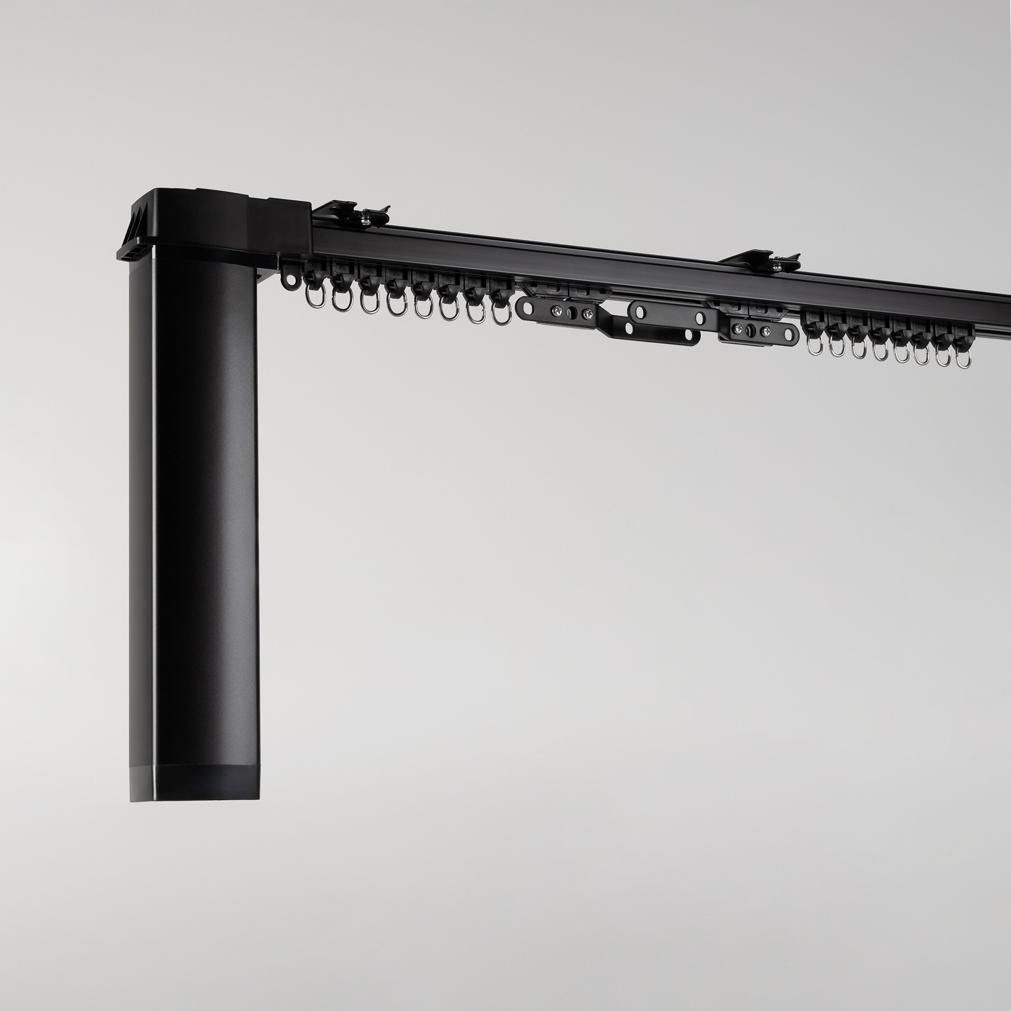 Комплект электрокарниза в черном цвете длиной до 2м (регулируется наборными частями) для раздвижных штор, состоящий из мотора, наборного алюминиевого трека, пульта и комплектующих. Электропривод с питанием 100-240В, мощность 45Вт, момент 1.2Нм, вес штор до 40кг. Управление с помощью пульта из комплекта, по WI-FI, 2.4ГГц, Bluetooth, "сухими" контактами на входе RJ11-4P4C. Совместим с платформой TUYA, АЛИСА от ЯНДЕКС. Управление со смартфона через приложение SmartLife, с помощью пульта в комплекте.