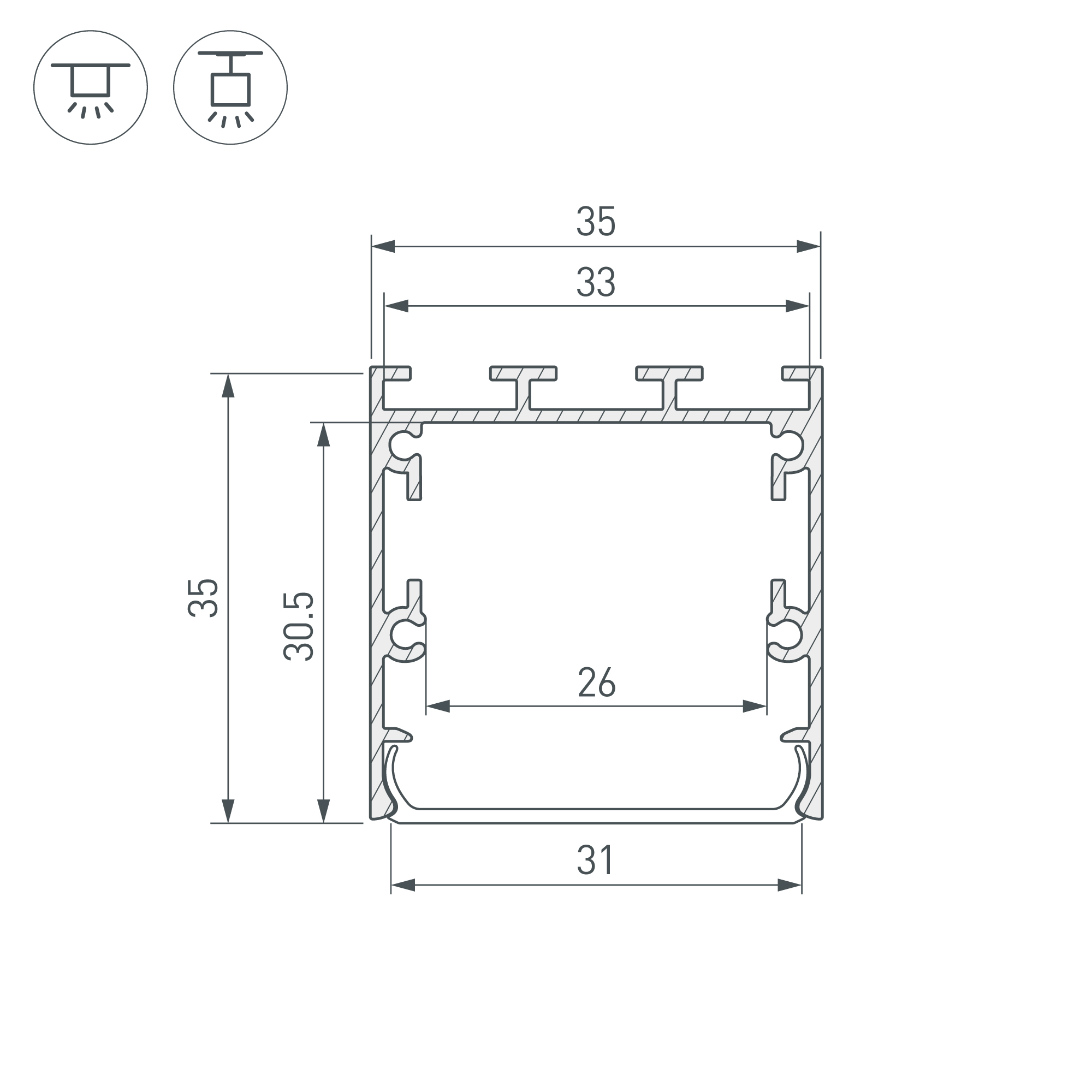 Габаритные размеры профиля составляют 2000 мм в длину, 35 мм в ширину и 35,5 мм в высоту. Площадка для установки светодиодных лент позволяет использовать ленту шириной до 26 мм и мощностью до 37 Вт/м. Это обеспечивает гибкость в выборе светодиодных лент и создает потрясающие световые решения.