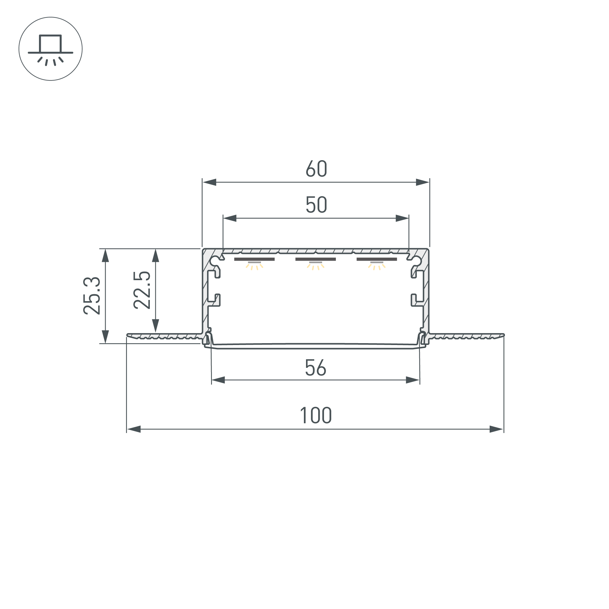 Алюминиевый анодированный профиль для встраивания в гипсокартон. Габаритные размеры (L×W×H): 3000x100x25,3 мм, паз для установки 60х22,5 мм. Ширина площадки для ленты - 50 мм. Экраны и заглушки приобретаются отдельно. Цена за 1 метр. Встраиваемый профиль со скрытым фланцем под строительную отделку из анодированного алюминия для основной и контурной подсветки помещений. Габаритные размеры профиля составляют 3000 мм в длину, 100 мм в ширину и 25,3 мм в высоту. Площадка для установки светодиодных лент позволяет использовать ленту шириной до 50 мм и мощностью до 65 Вт/м. Это обеспечивает гибкость в выборе светодиодных лент и создает потрясающие световые решения.