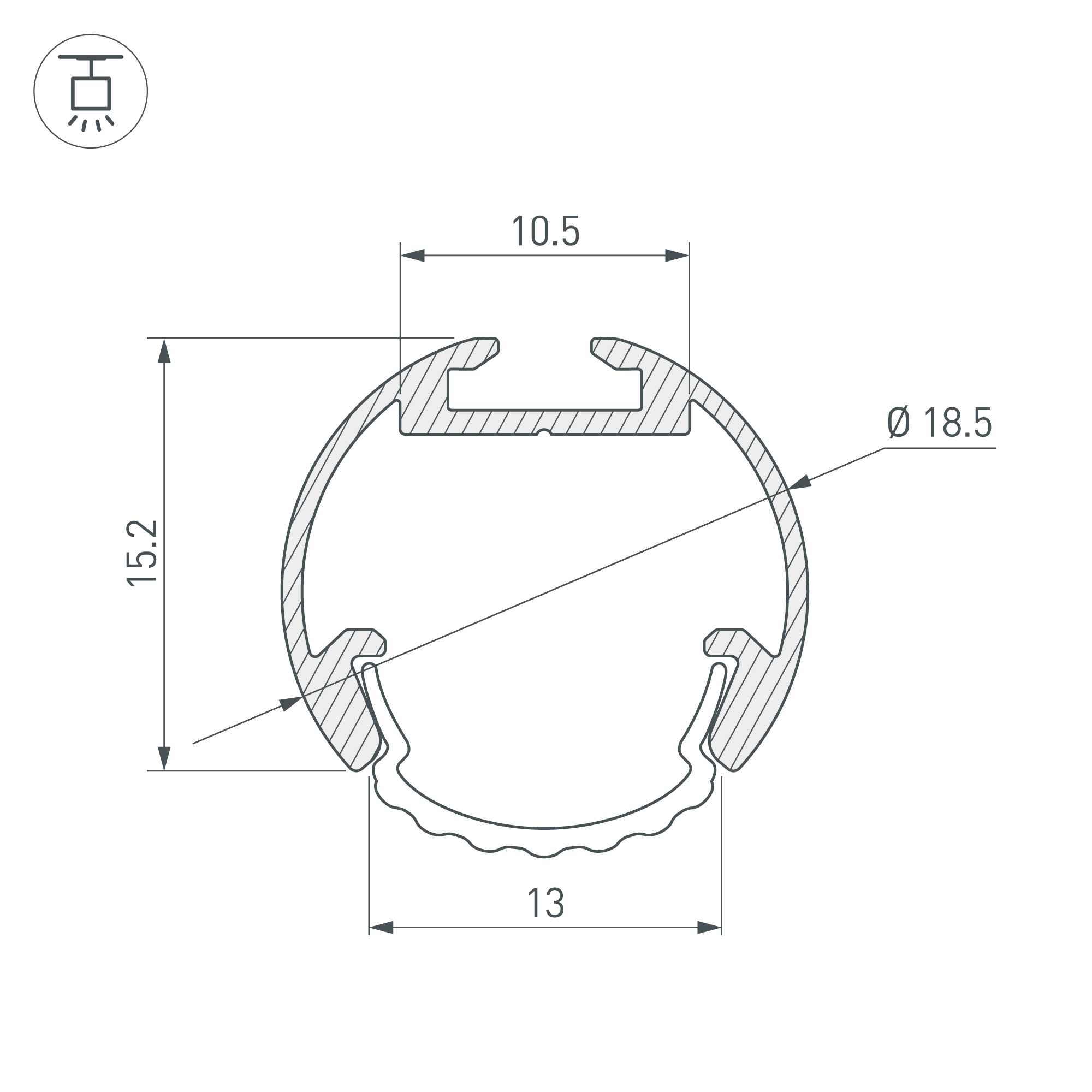 Алюминиевый анодированный круглый профиль для светодиодных лент и линеек. Подключение ленты без проводов при использовании кондукторных заглушек. Габаритные размеры профиля (L×W×H): 2000x18,5x15,2 мм. Габаритные размеры профиля с экраном (L×D): 2000xD18,5 мм. Ширина площадки для ленты 10,5 мм. Экраны, заглушки и другие аксессуары приобретаются отдельно. Цена за 1 метр. Подвесной профиль из анодированного алюминия для контурной подсветки элементов интерьера. Габаритные размеры профиля с полукруглым рассеивателем составляют 2000 мм в длину, 18,5 мм в ширину и 18,5 мм в высоту. Площадка для установки светодиодных лент позволяет использовать ленту шириной до 10,5 мм и мощностью до 14,7 Вт/м. Это обеспечивает гибкость в выборе светодиодных лент и создает потрясающие световые решения.